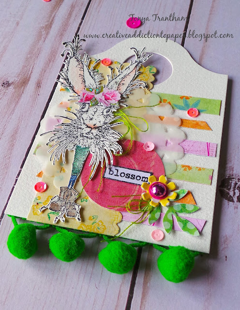 I stamped Herbert Hare Stamp onto a piece of watercolor paper, fussy cut out and watercolored with an assortment of Eileen Hull's ColorBox Ink which can be found HERE I added fussy cut set of roses to the head of the hare and then glued to the corner of the tag.