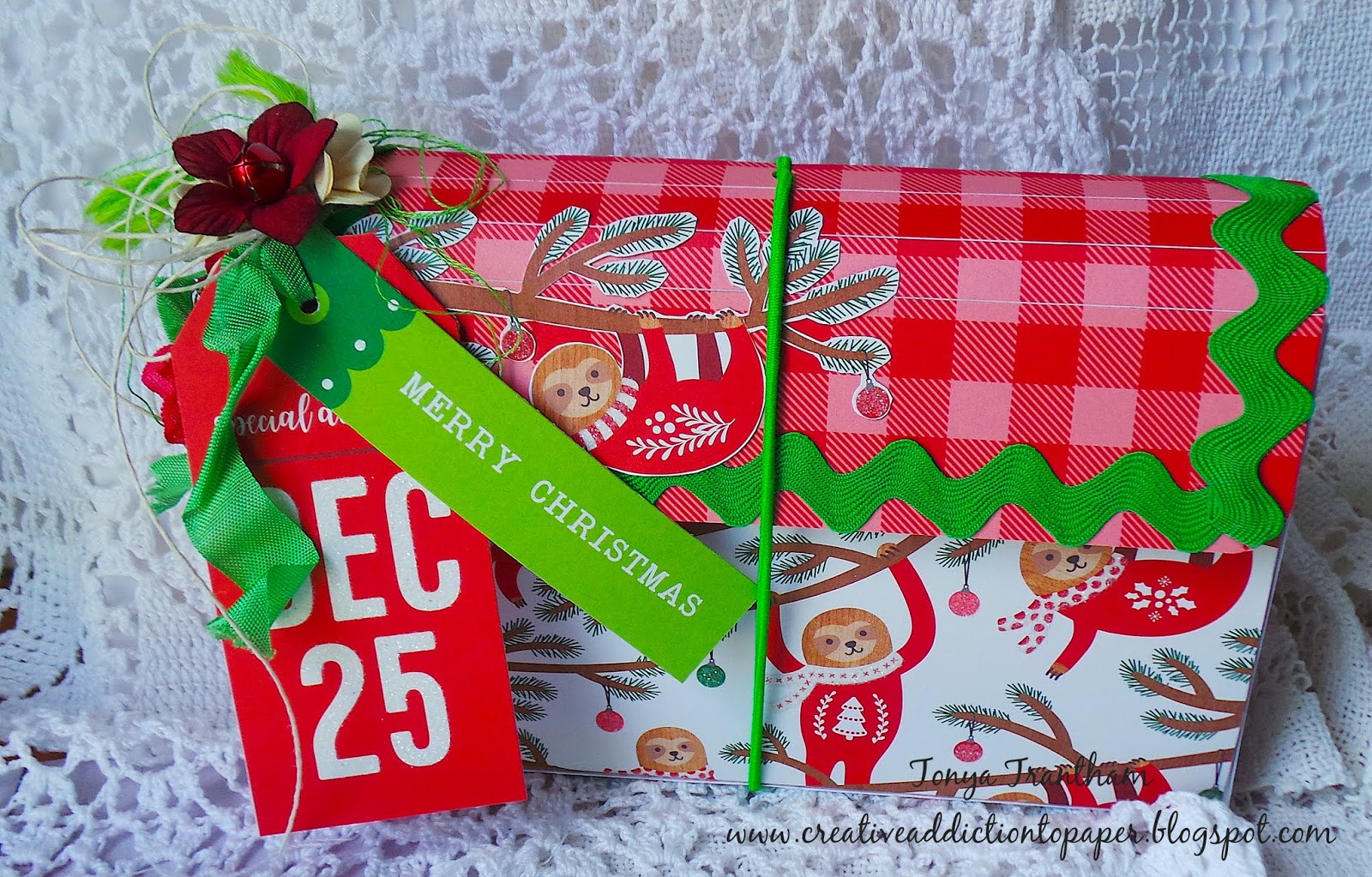 27. I love how you turned it into a gift box Tonya. Great idea! Super cute papers... love the sloth! The poinsettia with the tag look lovely.